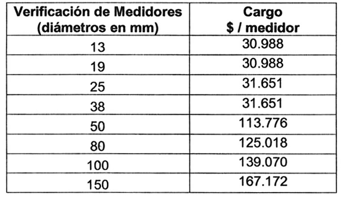 El prestador podrá cobrar por concepto de verificación de medidores el Cargo x IN14 de acuerdo a los siguientes valores: