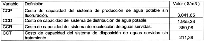 En caso que los sistemas de producción incorporen la fluoruración del agua potable el costo de capacidad del sistema de producción (CCPi) se incrementará en 32,27 pesos por metro cúbico.