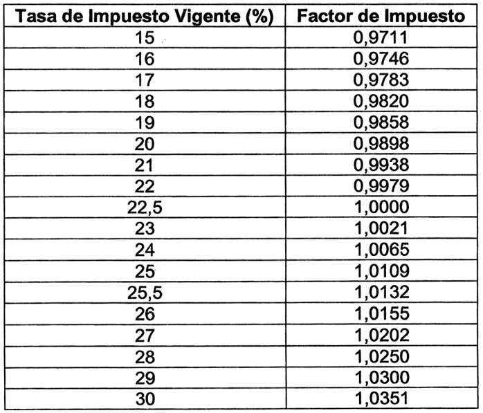 Los valores resultantes de la aplicación de los cargos anteriormente mencionados en este decreto, se incrementarán en función de la tasa de tributación vigente que grava las utilidades de las sociedades anónimas abiertas, considerando los factores para las tasas de tributación que se indican a continuación (tasas intermedias se interpolarán linealmente):