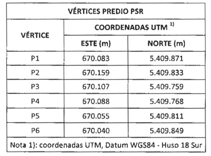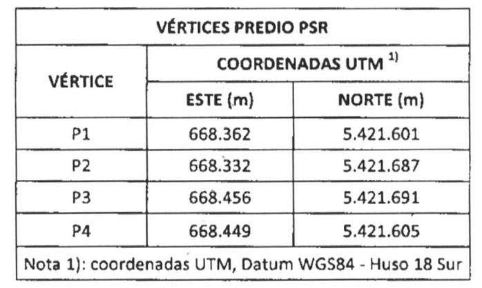 Los vértices que definen el área de instalación de la PSR en la comuna de Puerto Montt, se indican en la Tabla 1, en coordenadas UTM, Datum WGS84 - Huso 18 Sur.