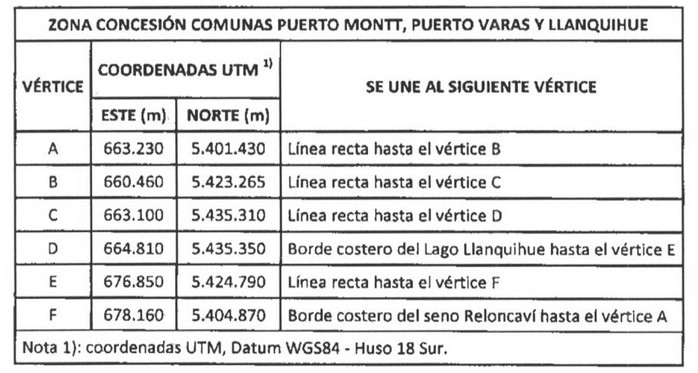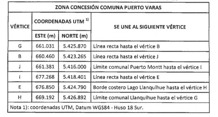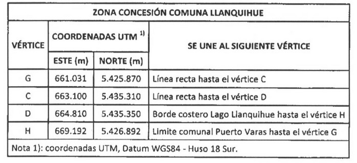 Tabla 8. Cuadro de coordenadas – Zona de Concesión comuna de Llanquihue