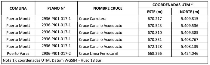 Décimo. La materialización de proyecto en la zona de servicio solicitada, en las comunas de Puerto Montt y Puerto Varas, comprometerá durante la construcción de las obras, por cruce subterráneo de tuberías en polietileno, las obras e instalaciones existentes, que se detallan en la Tabla 11: