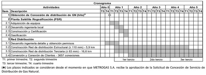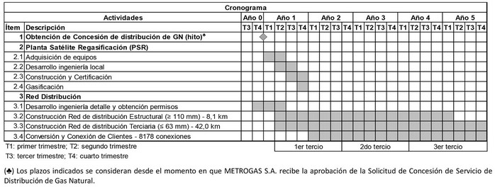 Décimo segundo. En la zona de concesión que se solicita, Metrogas S.A. distribuirá gas natural proveniente de dos PSR de GNL a instalar en las comunas de Puerto Montt y Puerto Varas, para suministrar y distribuir gas natural en dichas comunas, cuyas especificaciones deberán cumplir con la Norma Chilena NCh2264.Of2014, o la disposición que la reemplace.