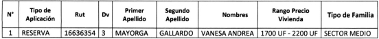 b) La reserva de una familia beneficiaria de un subsidio habitacional de llamado efectuado hasta el 31 de diciembre de 2015 de los Programas de Subsidio indicados en el artículo 2° del DS N° 116 (V. y U.), de 2014, efectuada hasta la fecha de la recepción municipal del proyecto singularizado en el Visto c), que corresponde a un 0,75 % de las viviendas del proyecto, cuya identificación consta en la nómina siguiente: