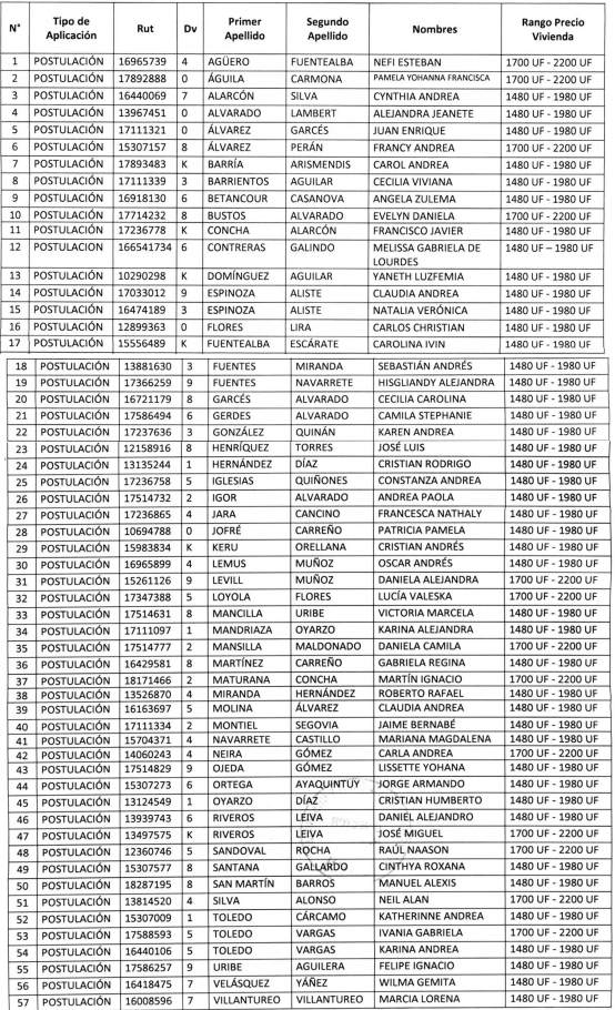 c) Las postulaciones de 57 familias de sectores medios efectuadas hasta la fecha de la recepción municipal del proyecto singularizado en el Visto c), cuya identificación consta en la nómina siguiente: