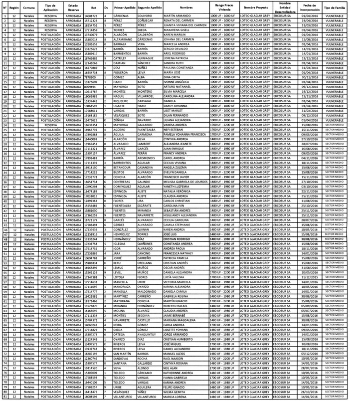 1. Apruébense las nóminas de postulantes seleccionados/as a que se refiere el Considerando d) de esta resolución, para el proyecto "Loteo Glaciar Grey", código 116570, para el subsidio establecido en el DS N° 116 (V. y U.), de 2014, que corresponden a 19 familias vulnerables y a 57 familias de sectores medios; apruébese también la aplicación de los 4 subsidios correspondientes de familias vulnerables y un subsidio de sectores medios que efectuaron reservas para este proyecto.