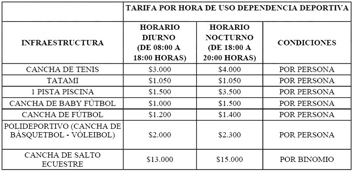 3.- Determínese que, conforme al procedimiento establecido en el artículo 16 del decreto supremo Nº 1.058, de 08.07.2016, que aprueba el Reglamento de la ley Nº 20.887, y sobre la base de lo determinado por parte de la Dirección de Finanzas de Carabineros de Chile, el costo por hora asociado al uso de las instalaciones y equipamiento deportivo, es el que a continuación se detalla: