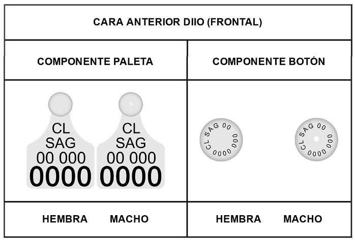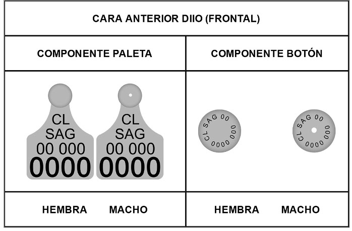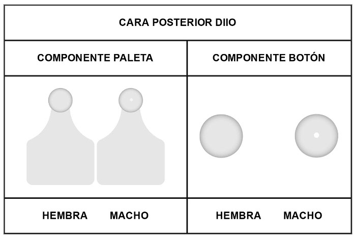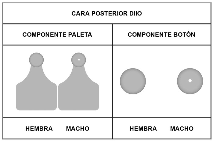 3.12 El componente visual tipo paleta (macho - hembra) deberá permitir la identificación visual del animal y contener la información impresa (cada uno de los datos de impresión estarán en cuatro líneas horizontales ordenados desde el límite superior al límite inferior del DIIO), con la siguiente información de acuerdo a cada especie: