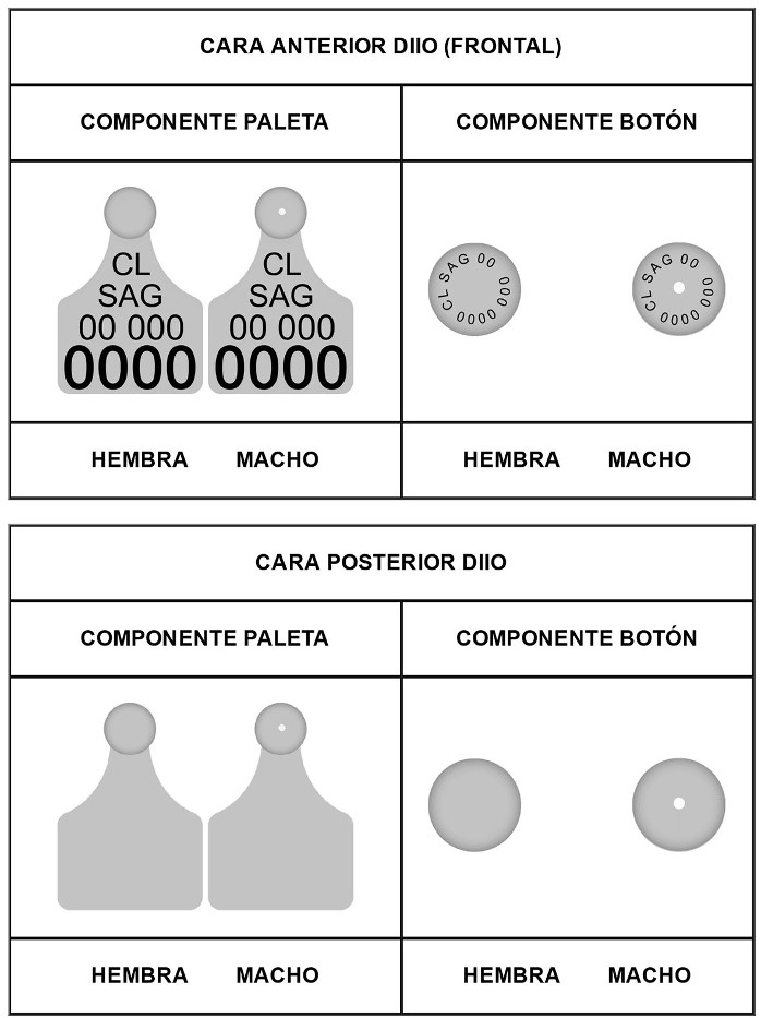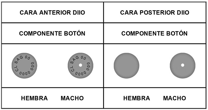 e. Dispositivo de Identificación Individual Oficial (DIIO): Corresponde a un "arete" de material plástico o un "bolo ruminal", donde se registra un número oficial único e irrepetible y posee un sistema de radiofrecuencia (RFID). Este debe cumplir con especificaciones técnicas, de acuerdo a cada especie animal que determine el Servicio. El DIIO tipo "arete", puede incluir dos componentes: un dispositivo visual tipo paleta (macho - hembra) y un dispositivo tipo botón (macho - hembra), que debe contener un chip con radiofrecuencia (RFID), o bien incluir sólo un componente tipo botón (macho - hembra), que debe contener un chip con radiofrecuencia (RFID). El DIIO tipo "bolo ruminal", está conformado por un dispositivo visual tipo paleta (macho - hembra), y un dispositivo tipo bolo ruminal que debe contener dentro un chip de radiofrecuencia (RFID).