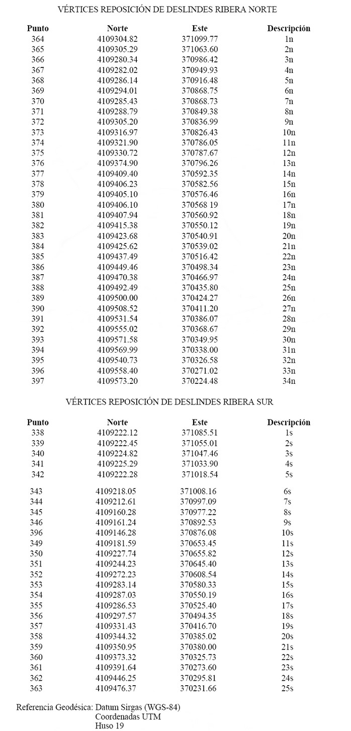 I.- Fíjase como deslindes del cauce del Río de Las Minas, sector aguas arriba del Puente Presidente Eduardo Frei Montalva, en la ciudad y comuna de Punta Arenas, provincia de Magallanes, Región de Magallanes y de la Antártica Chilena, individualizado en el plano Nº 12101-1326-CU, en el singularizado vértice o punto 364 a 397 ribera Norte y 338 a 363 Ribera Sur, y cuyos deslindes son: