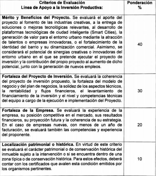 Que se trate de proyectos que fomenten las industrias creativas, entreguen soluciones o mejoras tecnológicas relevantes, desarrollen plataformas tecnológicas de ciudad inteligente (Smart Cities), valoricen el entorno urbano mediante la atracción de talentos o empresas innovadoras, o fortalezcan la identidad del barrio donde se inserten y promuevan su dinamización comercial.