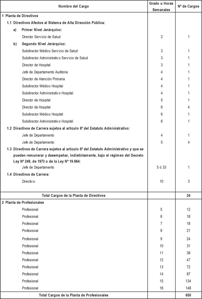 i.  Cargos de profesionales a proveer, de acuerdo a lo dispuesto en los artículos segundo y tercero transitorios del presente decreto con fuerza de ley, con indicación del número de cargos y su grado.