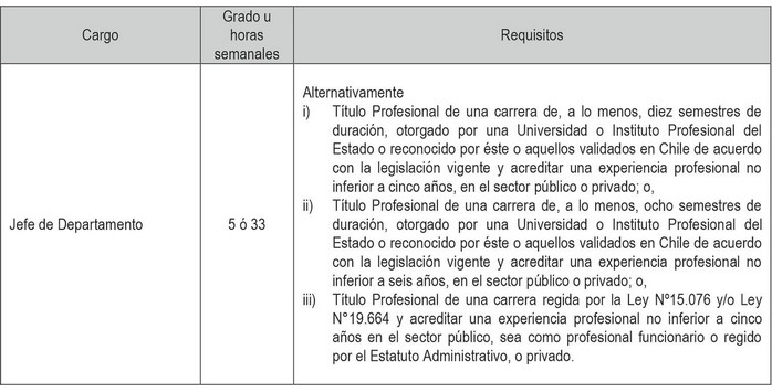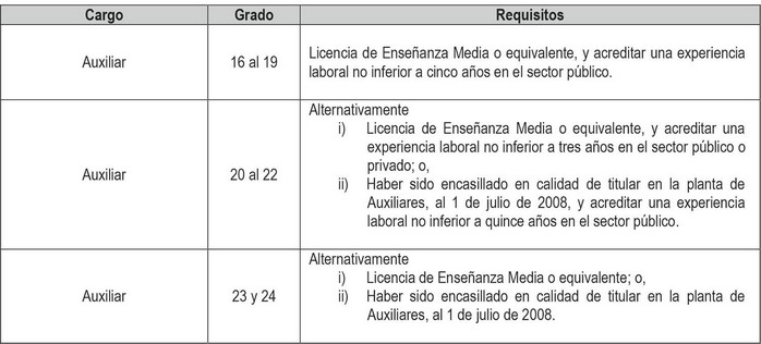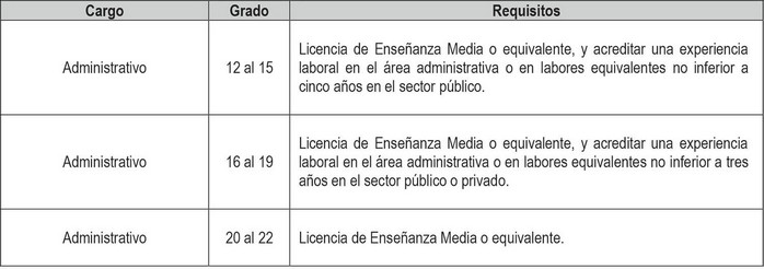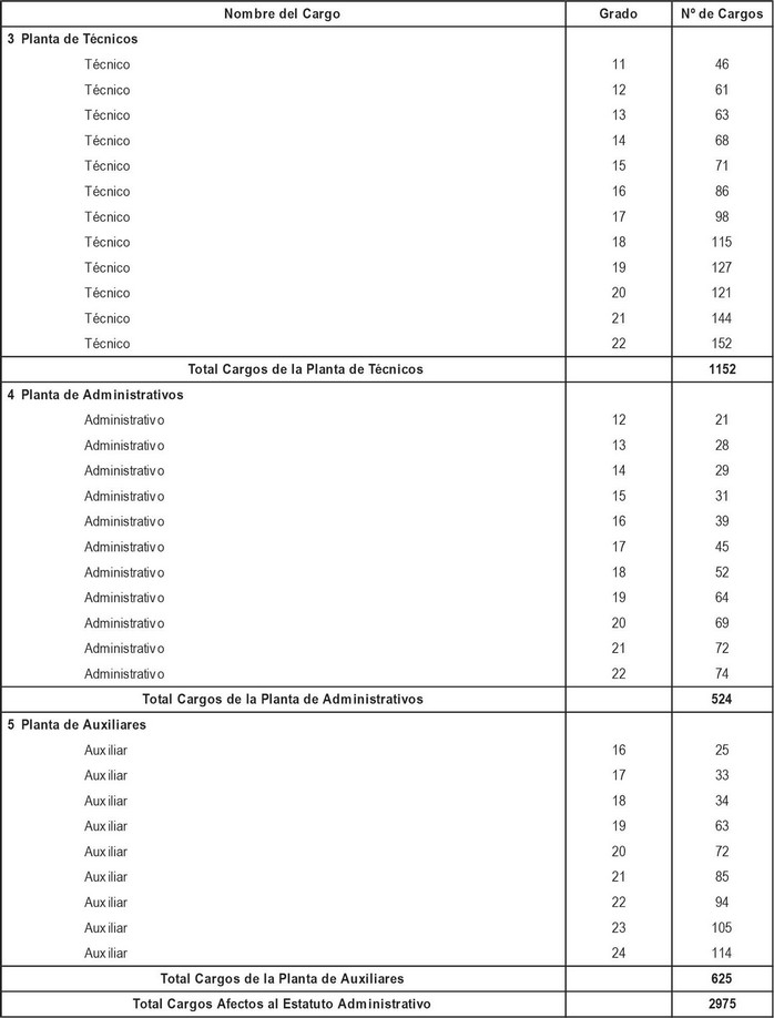 i.  Cargos de técnicos, administrativos y auxiliares a proveer, de acuerdo a lo dispuesto en los artículos segundo y tercero transitorios del presente Decreto con Fuerza de Ley, con indicación del número de cargos y su grado.