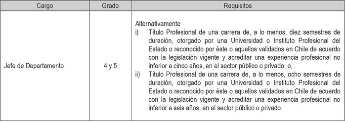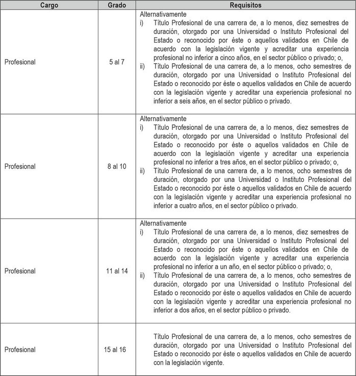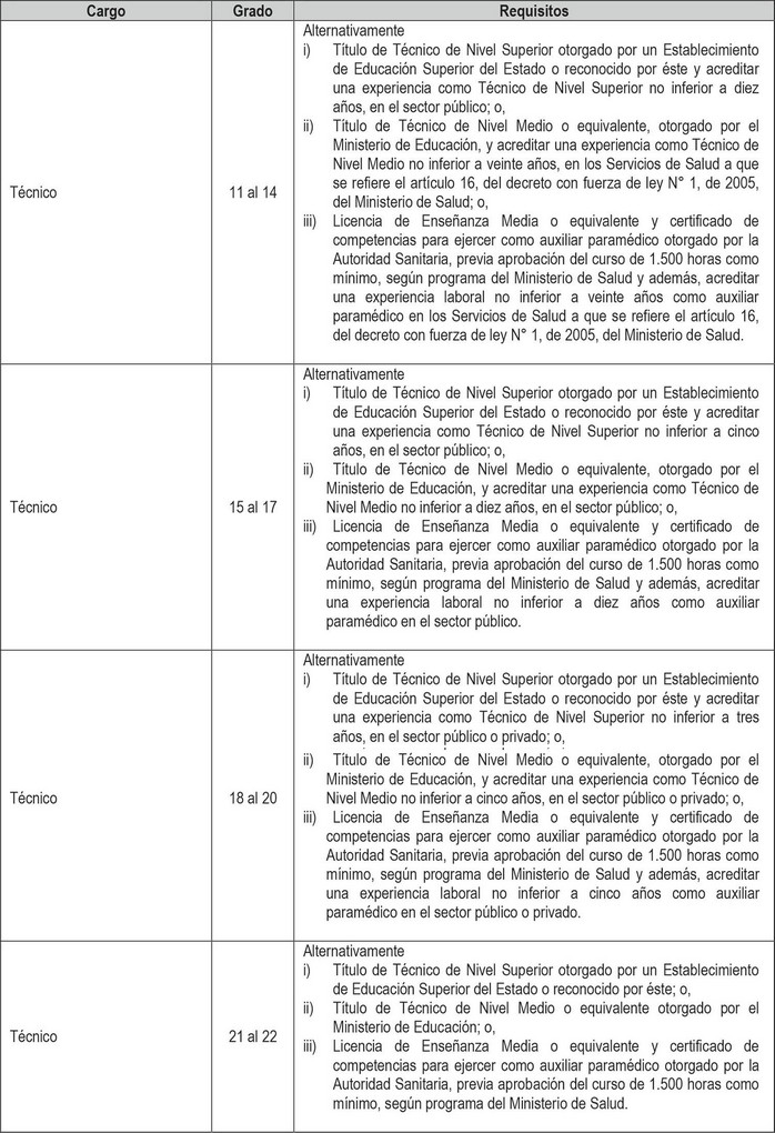Artículo 2º. Establécense los siguientes requisitos para el ingreso y promoción en las plantas y cargos que se indican a continuación: