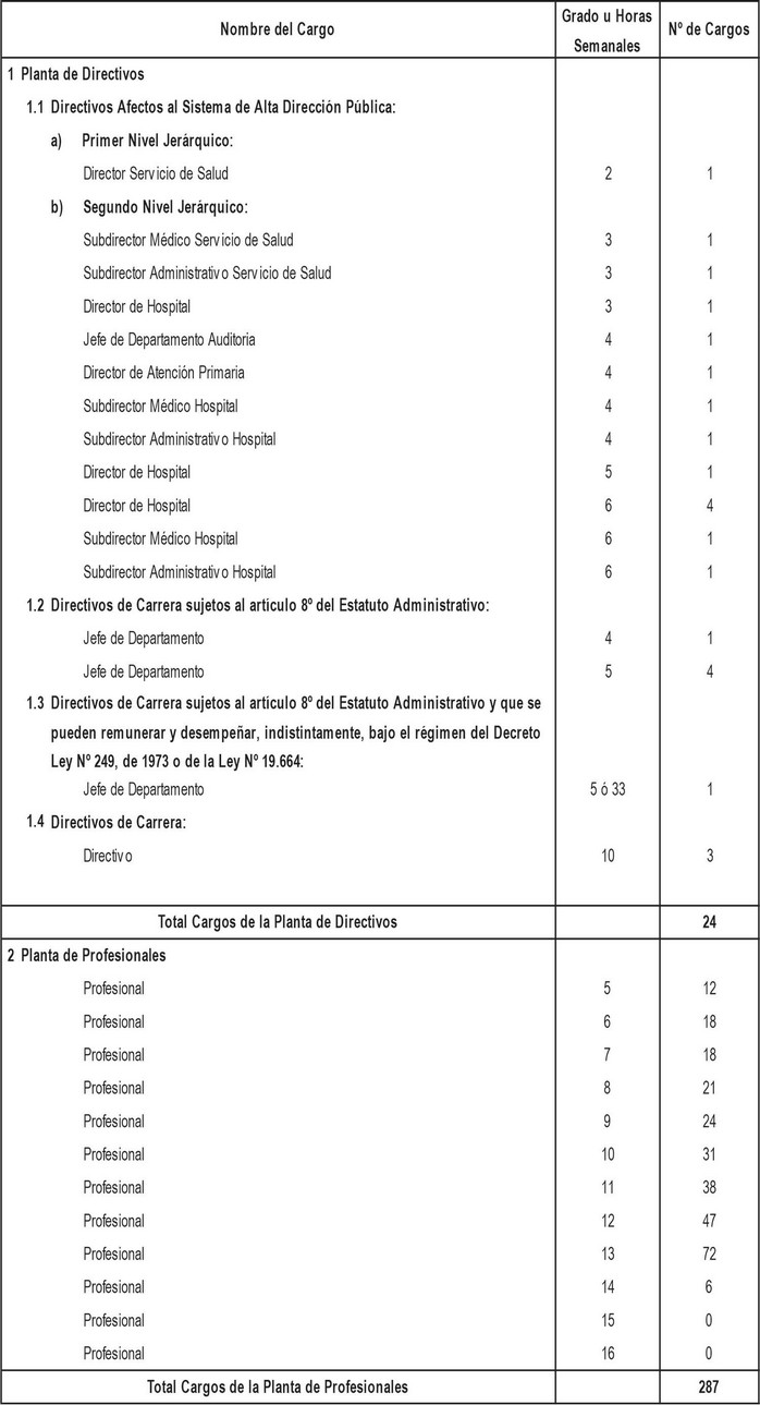 Artículo 1º. Fíjase la Planta de Personal del Servicio de Salud Metropolitano Sur, afecto a las normas del Decreto con Fuerza de Ley Nº29, de 2004, del Ministerio de Hacienda, que fija el texto refundido, coordinado y sistematizado de la Ley Nº18.834, en adelante, Estatuto Administrativo: