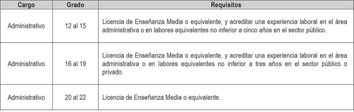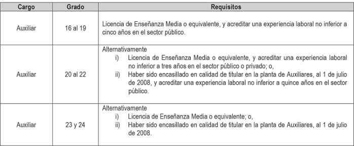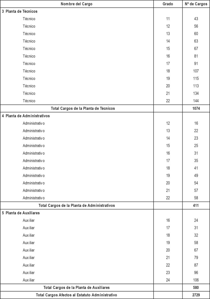 i. Cargos de técnicos, administrativos y auxiliares a proveer, de acuerdo a lo dispuesto en los artículos segundo y tercero transitorios del presente Decreto con Fuerza de Ley, con indicación del número de cargos y su grado.