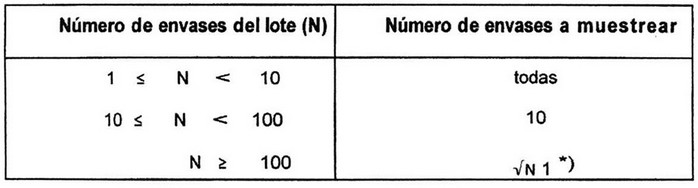 Por cada lote se deberá calcular el número de envases a muestrear, de acuerdo a lo establecido en la siguiente Tabla 1.