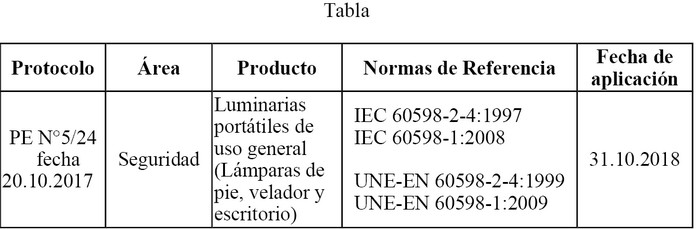 APRUEBA PROTOCOLO DE ANÁLISIS Y/O ENSAYOS PE N° 5/24:2017, DE FECHA 20.10.2017, PARA CERTIFICAR Y ENSAYAR LOS PRODUCTOS ELÉCTRICOS LUMINARIAS PORTÁTILES DE USO GENERAL (LÁMPARAS DE PIE, VELADOR Y ESCRITORIO), QUE SE INDICA