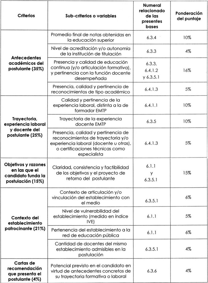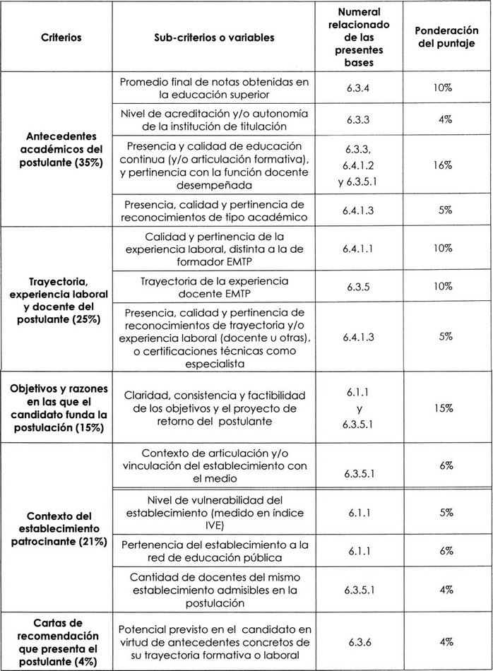 . VI. a) Criterio "Antecedentes académicos del postulante", subcriterios "Presencia y calidad de educación continua (y/o articulación formativa), y pertinencia con la función docente desempeñada" (además de la escala incluida más abajo, cabe señalar que este subcriterio es analizado considerando la relación entre el título de educación superior del postulante, con sus posibles estudios complementarios y la labor docente desempeñada en el establecimiento EMTP patrocinador) y "Presencia, calidad y pertinencia de reconocimientos de tipo académico";