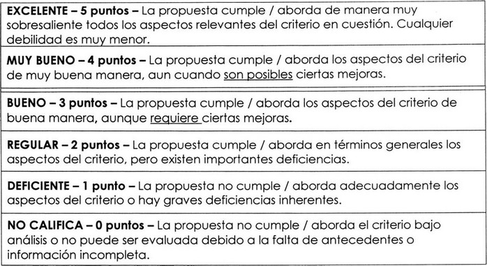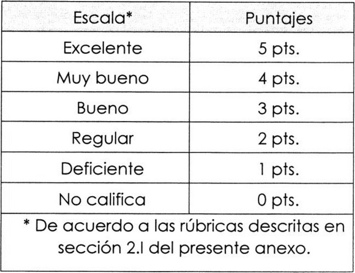 La escala de puntaje comprende el rango de 0 (cero) a 5 (cinco) puntos, de acuerdo al numeral 9.2 de las bases concursales. Las categorías o rúbricas se encuentran conceptualizadas de la siguiente forma: