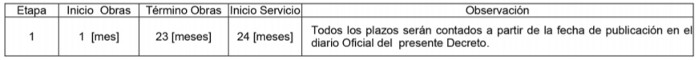 . 2. Los plazos máximos para el inicio y término de la construcción de las obras, así como para el inicio del servicio, de cada etapa, serán los que se indican a continuación: