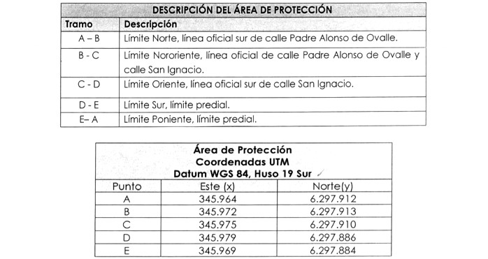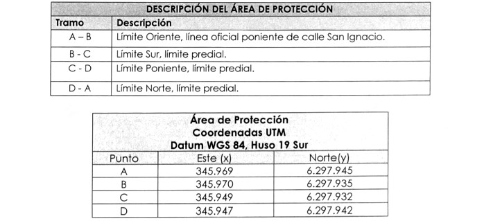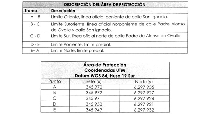El área protegida tiene una superficie de 246 mts.², como se grafica en el polígono con las letras A - B - C - D - E - A, del plano adjunto Nº 065-2017, de 13/12/2017, visado por el Consejo de Monumentos Nacionales, que forma parte del presente decreto y cuyos límites son los siguientes: