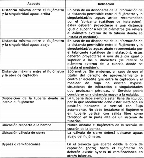 Cuadro 2. Indicaciones para la instalación del flujómetro.