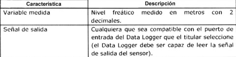 Sensor de niveles freáticos. Este equipo debe tener las características mínimas indicadas en Cuadro 3.