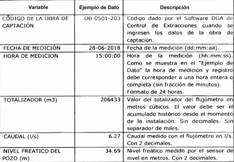 Los datos que deben ser remitidos al Software DGA de Control de Extracciones por cada medición se definen en el Cuadro 4.