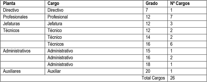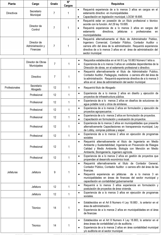 Artículo 2. Se deja establecido que de los 26 cargos creados, 8 requieren como requisito obligatorio título profesional, 3 título profesional o técnico, 10 título técnico, 4 corresponden a cargos administrativos y 1 auxiliar. Lo anterior en cumplimiento del Art. 49 bis número 4 de la ley 20.922.