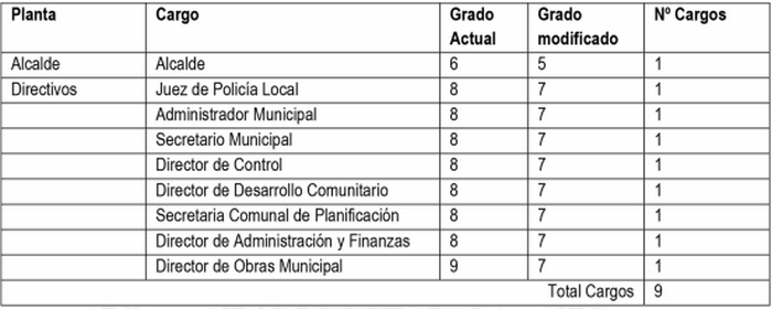 Artículo 4. El grado del director de obras municipales, se modifica del 9 al 7, para equiparar su nivel remuneratorio al de otras plazas jerárquicamente equivalentes, debido a su rol fundamental en el desarrollo comunal. Lo anterior considerando que las labores que ejecuta son exclusivas, indelegables por la calidad que inviste, correspondiéndole velar de manera permanente por el cumplimiento de la normativa legal vigente en lo relativo a la Ley Orgánica Constitucional de Municipalidades Nº 18.695, la Ley General de Urbanismo y Construcción, la Ordenanza General de Urbanismo y Construcción, plan regulador y otras normas. Importante es señalar que este cargo reviste particular importancia considerando que desde el año 2000 a la fecha, se han construido 8 complejos habitacionales nuevos, con un número superior a 1.000 edificaciones, esto ha influido considerablemente en un aumento de las viviendas sociales, lo que se suma a un mayor número de viviendas construidas en los sectores rurales, que se emplazan en todo el territorio de más de 700 k² que está bajo su jurisdicción; la comuna de Santa Juana, además, es la que presenta el mayor índice de constructibilidad de la región. Particular importancia hoy tiene el cargo de Director de Obras en la fiscalización, regulación y contención de "loteos brujos", en la planificación urbana, en materia de pavimentación. Adicionalmente y considerando que la planta del DFL 95-19.321 solo consideró el cargo de Director de Obras más un apoyo administrativo, debe hacerse cargo de todo el quehacer comunal en la materia, además del alumbrado público, así como la ejecución de proyectos a fondos postulados por el municipio.