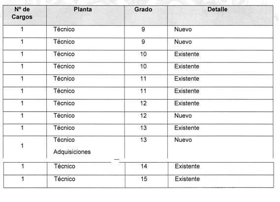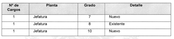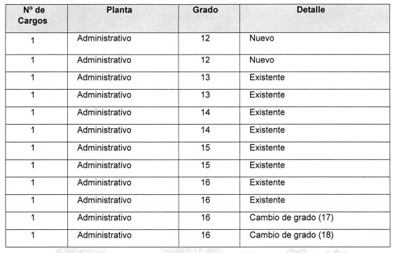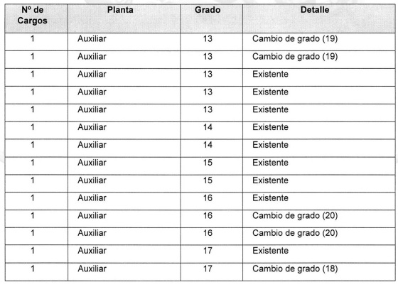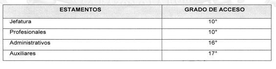 Artículo 1: Modifíquense los grados de acceso a las Plantas de Jefatura, Profesionales, Administrativos y Auxiliares, según el siguiente detalle:
