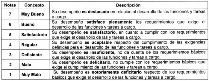 . Artículo 4°.- El Proceso de Evaluación del Desempeño evaluará los factores y subfactores señalados, por medio de notas que tendrán los siguientes guarismos, conceptos y descripciones: