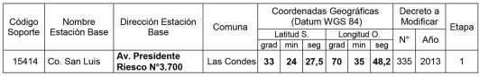 1. Autorízase a la concesionaria para modificar la ubicación, de una (1) estación base, autorizada por decreto supremo Nº93 de 2000, quedando la ubicación como se indica a continuación: