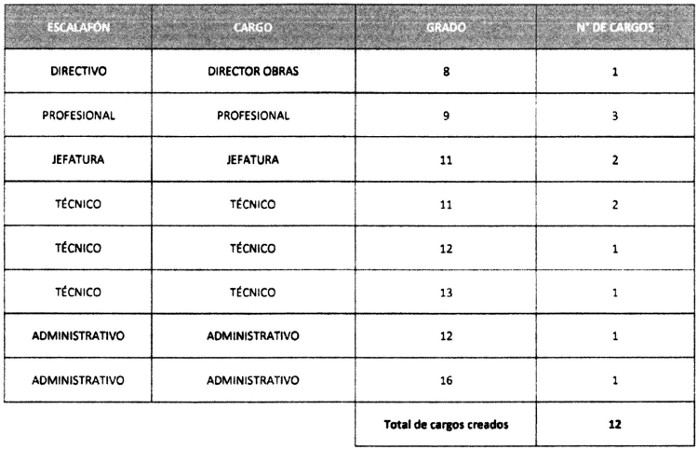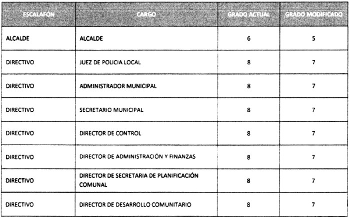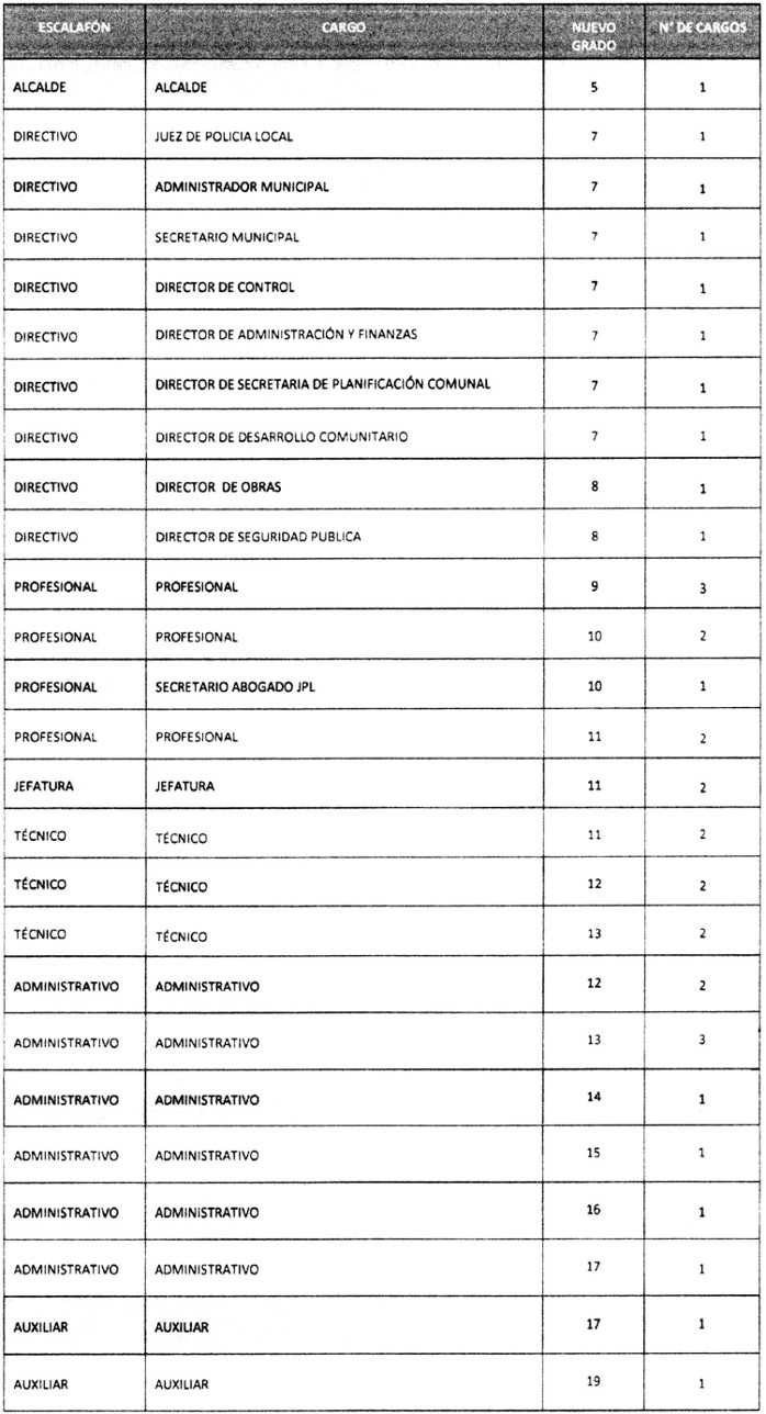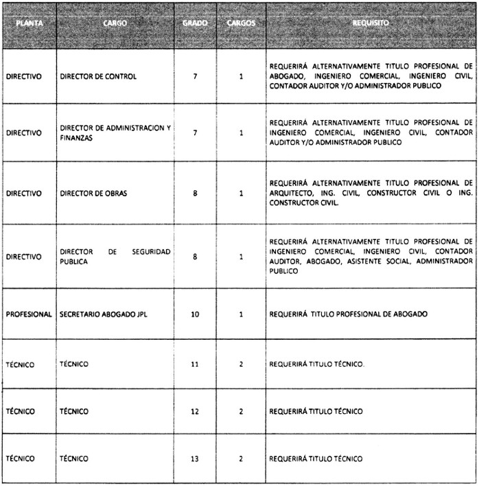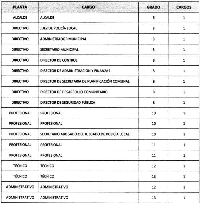 Artículo 2º.- Conforme al decreto con fuerza de ley Nº 214-19.321, de fecha 26/09/1994; modificado por la ley Nº 20.554, publicada el 23/01/2012, en el sentido que incorporó en la planta de Directivos Grado 8º, un cargo de Juez de Policía Local y en la planta de Profesionales Grado 10º, un cargo de secretario abogado de juzgado de Policía Local; decreto alcaldicio Nº 1.370 de fecha 27/07/2012, que crea el cargo de Administrador Municipal, grado 8º planta directiva, de acuerdo a ley Nº 18.695 y sesión ordinaria de concejo municipal Nº 83 de fecha 21/03/2011; la ley Nº 20.742 de fecha 01/04/2014, que crea los cargos en la planta directivo de: Director de Administración y Finanzas grado 8º, Director de Secretaría de Planificación Comunal grado 8º y Director de Control grado 8º; Las disposiciones transitorias establecidas en los artículos primero, segundo, tercero, y cuarto de la ley Nº 20.922 y; el decreto alcaldicio Nº 5.757 de fecha 06/12/2017, que creó el cargo de Director de Seguridad Pública, de acuerdo a lo prescrito en la ley Nº 20.965, de 04/11/2016; la que se compone del número de cargos y sus correspondientes grados, que a continuación se indican: