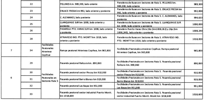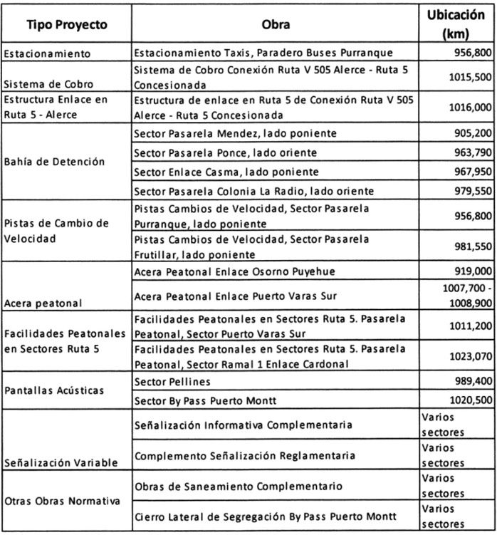 7° Que en virtud de lo señalado precedentemente, el Ministerio de Obras Públicas estimó de interés público y urgencia modificar las características de las obras y servicios del contrato de concesión, en el sentido de ejecutar un conjunto de inversiones que permitirán otorgar un nivel de servicio y seguridad para los usuarios acorde al desarrollo experimentado en el entorno durante la vigencia del contrato de concesión, tales como paraderos de buses, refugios peatonales, pasarelas peatonales, circuitos peatonales, calles de servicio, señalización, iluminación y los correspondientes trabajos de saneamiento de los sectores a intervenir. Lo anterior, toda vez que se ha determinado que la conectividad vial y peatonal de las obras existentes en la Concesión Ruta 5, Tramo Río Bueno - Puerto Montt requieren de mejoras urgentes para disminuir las tasas de accidentabilidad por efectos de circulación o cruce de peatones, y disminuir los niveles de aislamiento o dificultades de accesibilidad de localidades y comunidades vecinas a la ruta. Adicionalmente, existen áreas o zonas que requieren ser actualizadas a las normas de seguridad vial contenidas en el "Manual de Carreteras" de la Dirección de Vialidad del Ministerio de Obras Públicas y respecto de las normas de señalización contenidas en el "Manual de Señalización de Tránsito" del Ministerio de Transportes y Telecomunicaciones.