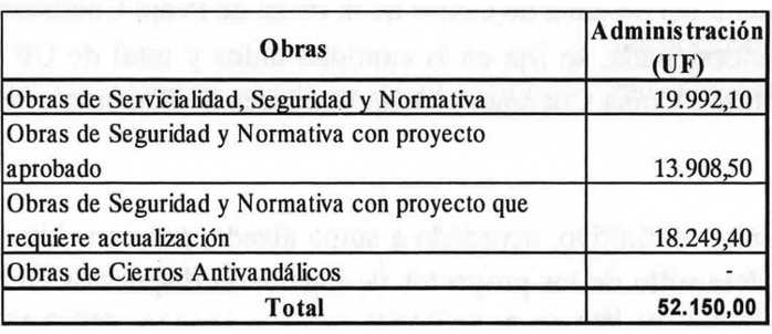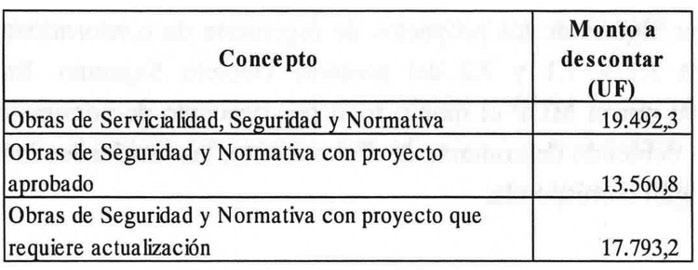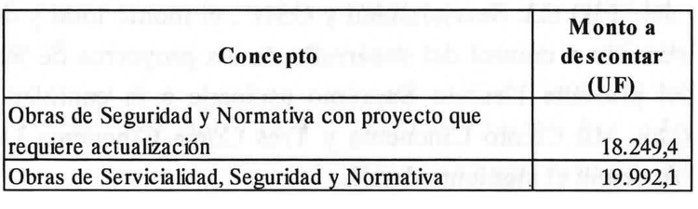 . b) En el caso que la Sociedad Concesionaria quede liberada de la obligación de ejecutar las "Obras de Seguridad y Normativa con proyecto que requiere actualización" y las "Obras de Servicialidad, Seguridad y Normativa" producto de que no se desarrollaron los proyectos de ingeniería respectivos, no será reconocido por el MOP el monto total por concepto de administración y control antes señalado, debiendo descontarse de dicho monto, las cantidades indicadas en el siguiente detalle según corresponda: