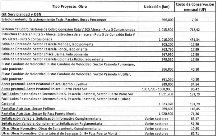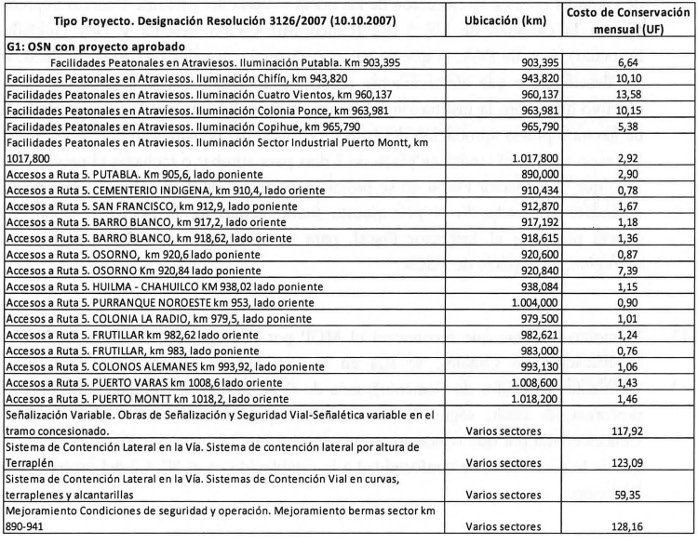 i) Ejecutar, conservar, mantener, operar y explotar las obras que se deriven de los proyectos de ingeniería que adjuntó el Inspector Fiscal en su Oficio Ord. N° 415/EXPL. RB-PM/2017, de fecha 22 de noviembre de 2017, y que se señalan en la Tabla N° 1 siguiente, denominados en conjunto como "PID G1: OSN con proyecto aprobado".