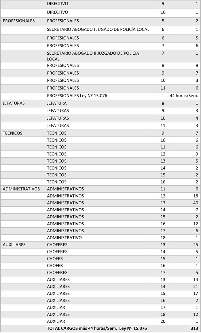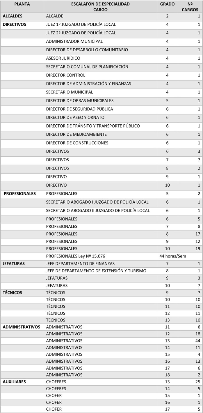 Luego, la ley 20.922 que modificó la planta de personal según los decretos alcaldicios Nº 3073 del 15 de noviembre de 2018 y Nº 3074 del 15 de noviembre de 2018 y el decreto alcaldicio Nº 565 del 22 de febrero de 2018, deja finalmente establecida la planta de personal de la Municipalidad de Talcahuano en 313 cargos.