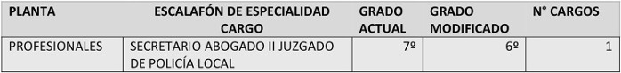. Justifíquese la modificación del grado de la planta Profesional correspondiente, al cargo de Secretario Abogado del II Juzgado de Policía Local, de grado 7º a 6º, en virtud del reconocimiento legal del cargo, y con la finalidad de equiparar su nivel remuneratorio al de las demás plazas jerárquicamente equivalentes al cargo de Secretario Abogado del Juzgado de Policía Local, Ley Nº 20.554, en la planta Profesionales de la Municipalidad de Talcahuano.