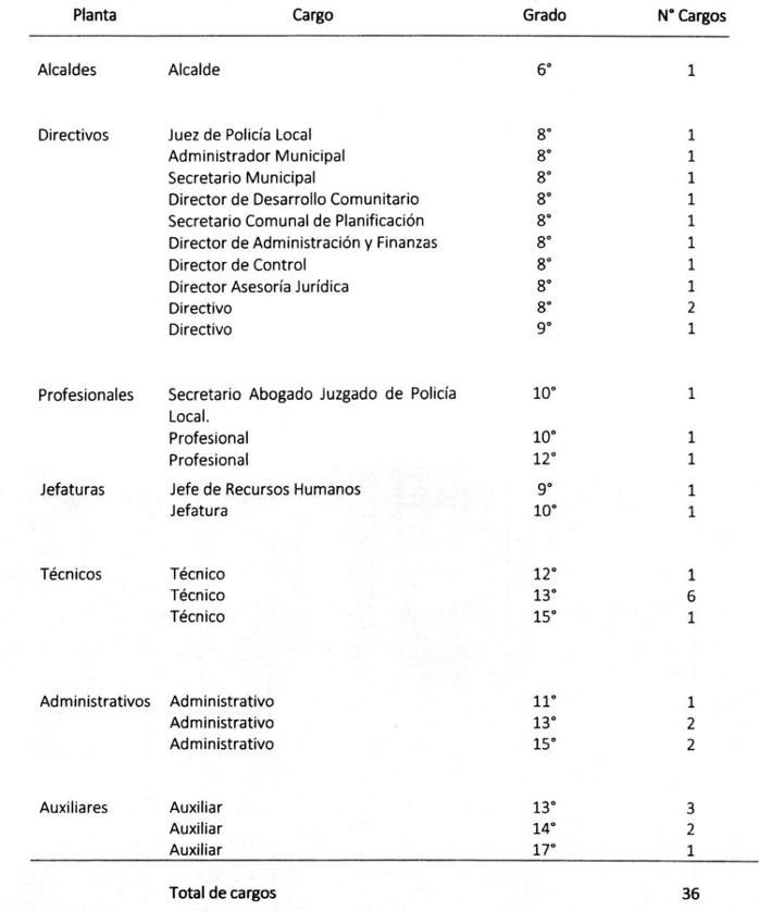 5º.- Que, para los efectos de la carrera funcionaria, cada municipalidad sólo podrá tener las siguientes plantas de personal: de Directivos, de Profesionales, de Jefaturas, de Técnicos, de Administrativos y de Auxiliares y dichas plantas municipales tendrán las siguientes posiciones relativas: