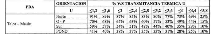 . b) Identificar el porcentaje máximo permitido de superficie de ventana por orientación, según transmitancia térmica del complejo de ventanas conforme a Tabla 2. En el caso que el proyecto de arquitectura considere ventanas de distinto valor de transmitancia térmica U en una misma orientación, el porcentaje máximo permitido de superficie de ventanas corresponderá al de la ventana de mayor valor U de dicha orientación.
