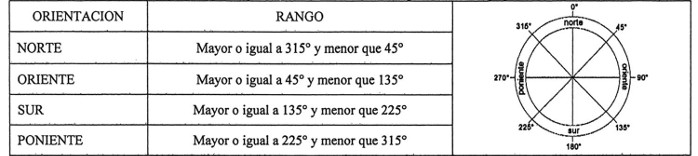 a) Identificar las orientaciones correspondientes a los paramentos verticales de la envolvente. Se deberá determinar la orientación predominante para cada muro perimetral de la unidad habitacional a partir de la dirección de su normal, expresada en grados sexagesimales. La dirección 0º estará definida por el norte geográfico, por lo que las orientaciones estarán limitadas de acuerdo a lo establecido en la Tabla 2.