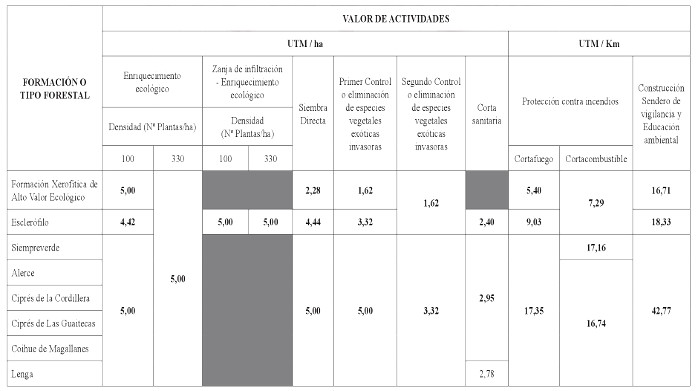 .TABLA DE VALORES ACTIVIDADES LEY Nº 20.283, BOSQUE NATIVO DE PRESERVACIÓN O FORMACIONES XEROFÍTICAS DE ALTO VALOR ECOLÓGICO (UTM/ha, UTM/Km).