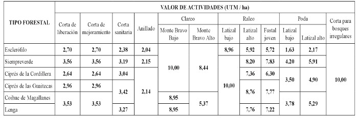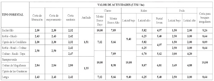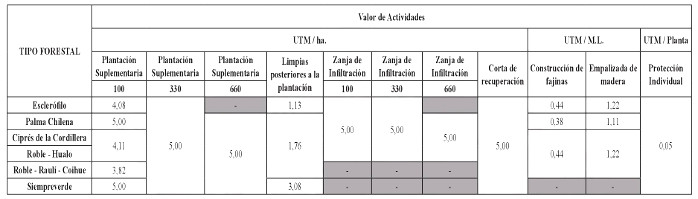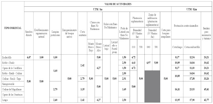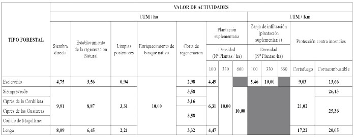 TABLA DE VALORES ACTIVIDADES LEY Nº 20.283, PRODUCCIÓN MADERERA (UTM/ha, UTM/Km).