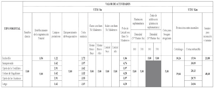 .TABLA DE VALORES ACTIVIDADES LEY Nº 20.283, PRODUCCIÓN NO MADERERA (UTM/ha, UTM/Km).