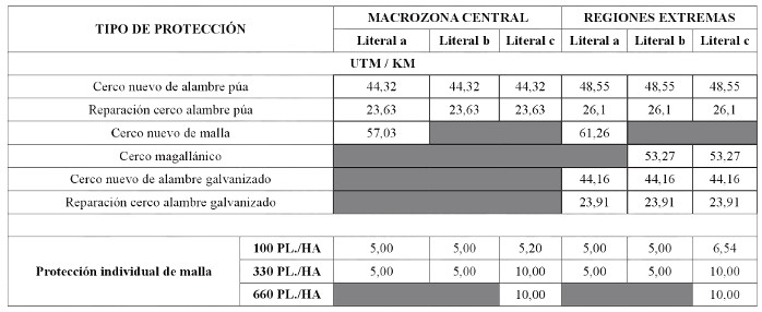 TABLA DE VALORES ACTIVIDAD DE PROTECCIÓN MEDIANTE CERCOS (UTM/ha, UTM/Km)