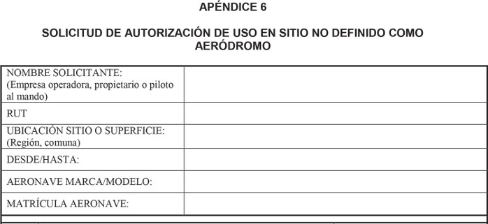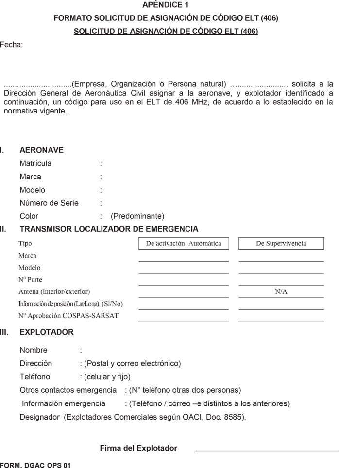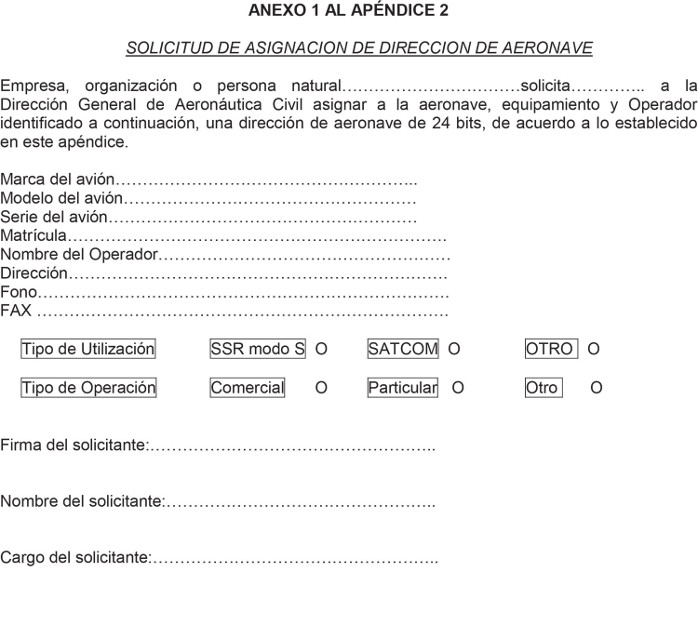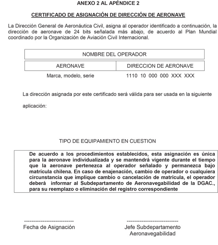 (1) Todo Operador de aeronave de matrícula chilena que tenga instalado y aprobado por la DGAC, equipamiento que requiera una dirección de aeronave de 24 bits para cumplir la función para la cual fue diseñado, deberá solicitarla al Subdepartamento de Aeronavegabilidad de la DGAC usando el formulario del Anexo 1 a este Apéndice (2).