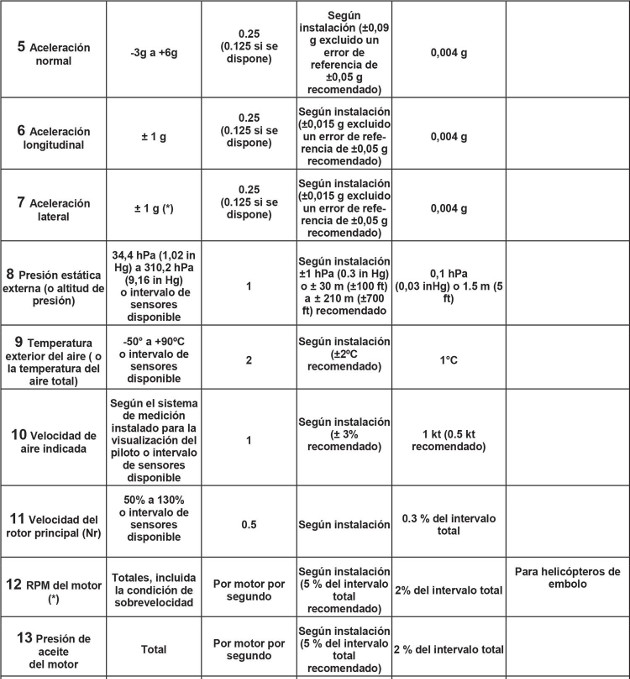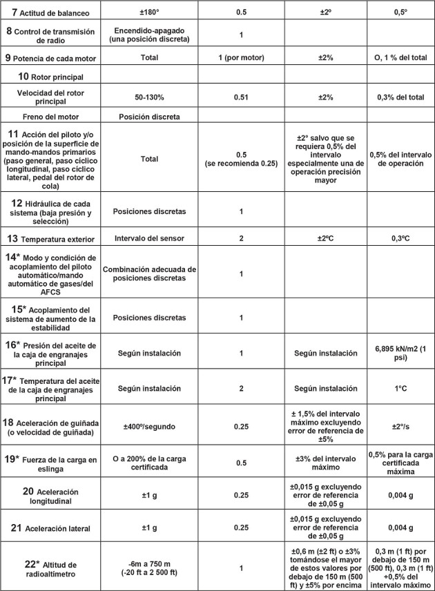 El número de parámetros que se registrarán dependerá de la complejidad del helicóptero. Los parámetros que no llevan asterisco (*) son obligatorios y deberán registrarse cualquiera que sea la complejidad del helicóptero. Además, los parámetros indicados con asterisco (*) se registrarán si los sistemas del helicóptero o la tripulación de vuelo emplean una fuente de datos de información sobre el parámetro para la operación del helicóptero. No obstante, pueden sustituirse por otros parámetros teniendo debidamente en cuenta el tipo de helicóptero y las características del equipo de registro.
