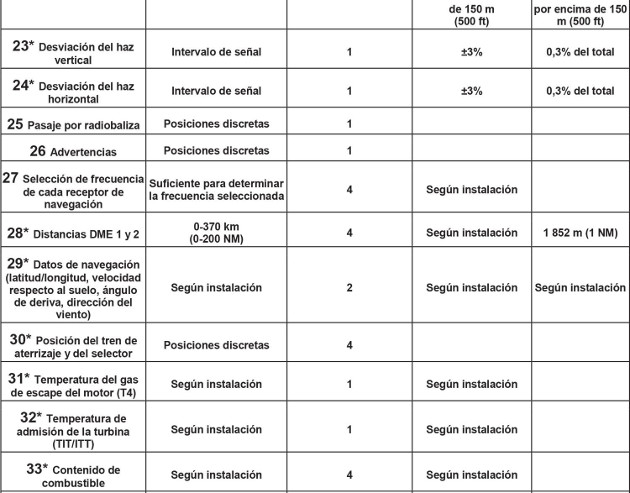 (*) Otra información operacional obtenida de presentaciones electrónicas, tales como sistemas electrónicos de instrumentos de vuelo (EFIS), monitor electrónico centralizado de aeronave (ECAM) y sistema de alerta a la tripulación y sobre los parámetros del motor (EICAS); y